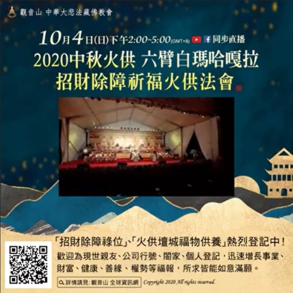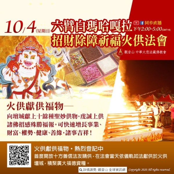 觀音山 2020中秋火供–六臂白瑪哈嘎拉 招財除障祈福 火供法會 月來月慈悲GYS2020/10/03【觀音山 2020中秋火供–六臂白瑪哈嘎拉 招財除障祈福 火供法會】 ◆法會時間|2020年10月4日(日)…