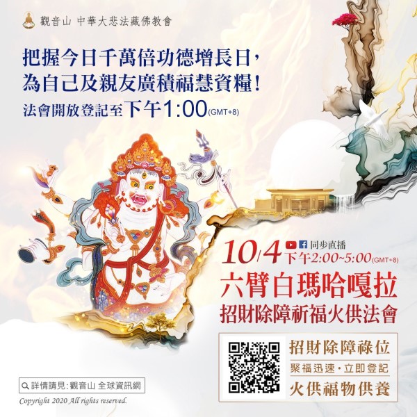 觀音山2020中秋火供-六臂白瑪哈嘎拉 招財除障祈福 火供法會,登記倒數計時中 月來月慈悲GYS2020/10/03【?️10月4日現場法會直播】 觀音山2020中秋火供-六臂白瑪哈嘎拉 招財除障祈福 火供法會,「招財除障祿位…