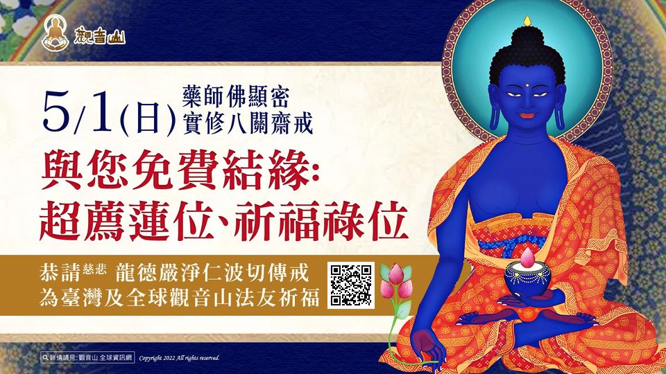 臺灣本土新冠肺炎疫情延燒,確診人數每日快速攀升,屢創新高;全球各地疫情仍嚴峻,尚未平息。慈悲 龍德上師心繫眾生,特別囑咐觀音山於5月1日(日)勞動節假期,舉辦「觀音山LIVE直播—藥師佛顯密實修八關齋戒」,法會當日早上8:00恭請慈悲 龍德上師傳戒。