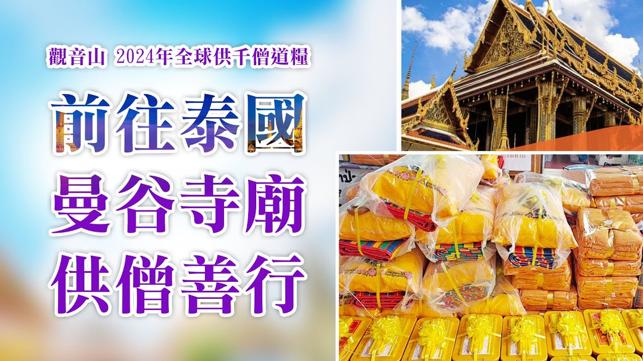 「觀音山 2024年結夏安居 全球供千僧道糧」前往泰國曼谷地區多處寺廟,進行供僧善行。泰國是佛教國家,很注重供養僧眾的細節和禮俗,觀音山特別準備最適合泰國當地寺廟出家僧眾之所需,將來自「觀音山 全球供千僧道糧」善信法友發心護持的四事供養及日用品,虔敬供養僧眾;出家僧眾們也特別為觀音山所有護持及參加供千僧殊勝善行的善信法友迴向。
