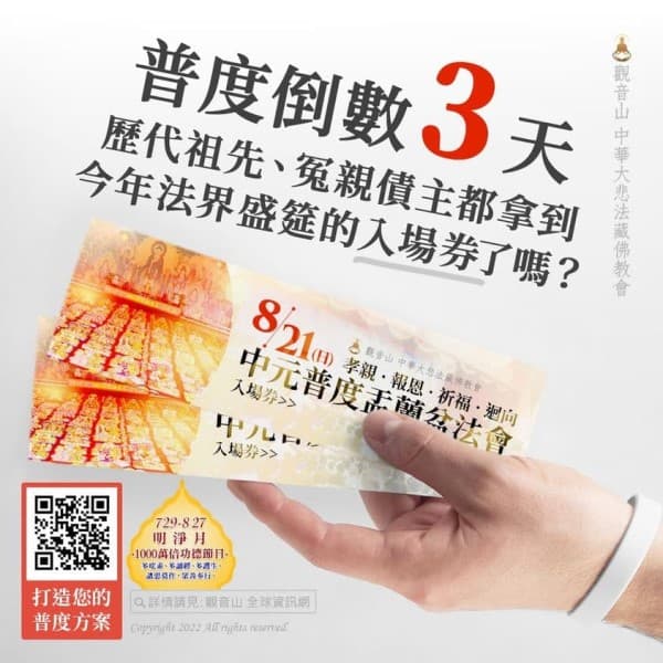 【普度倒數三天:歷代祖先、冤親債主都拿到今年法界盛筵的入場券了嗎?】 普度法會, 熱門文章GYS2022/08/18【普度倒數三天:歷代祖先、冤親債主都拿到今年法界盛筵的入場券了嗎?】 一場普度法會,可解幽冥眾生…