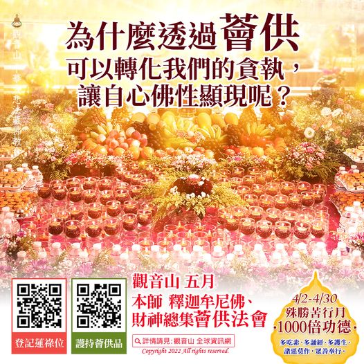 觀音山 2022年5月薈供法會–速獲本師與財神加持與護佑! 護持薈供GYS2022/04/26?觀音山 五月本師 釋迦牟尼佛、財神總集薈供法會 ◕恭立「除障祿位、超薦蓮位」▸ https://bit.ly…