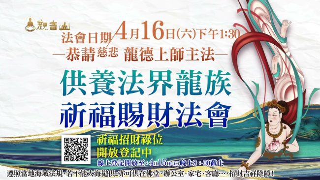 觀音山 4月16日 「供養法界龍族祈福賜財法會」 其他法會, 最新法會活動GYS2022/03/26?觀音山 4月16日 「供養法界龍族祈福賜財法會」—賜財福、免災病 祈福招財祿位 開放登記中 ▸https:/…