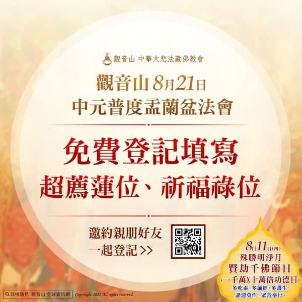 【?請廣傳分享】免費超薦蓮位、祈福祿位—觀音山 8月21日中元普度盂蘭盆法會